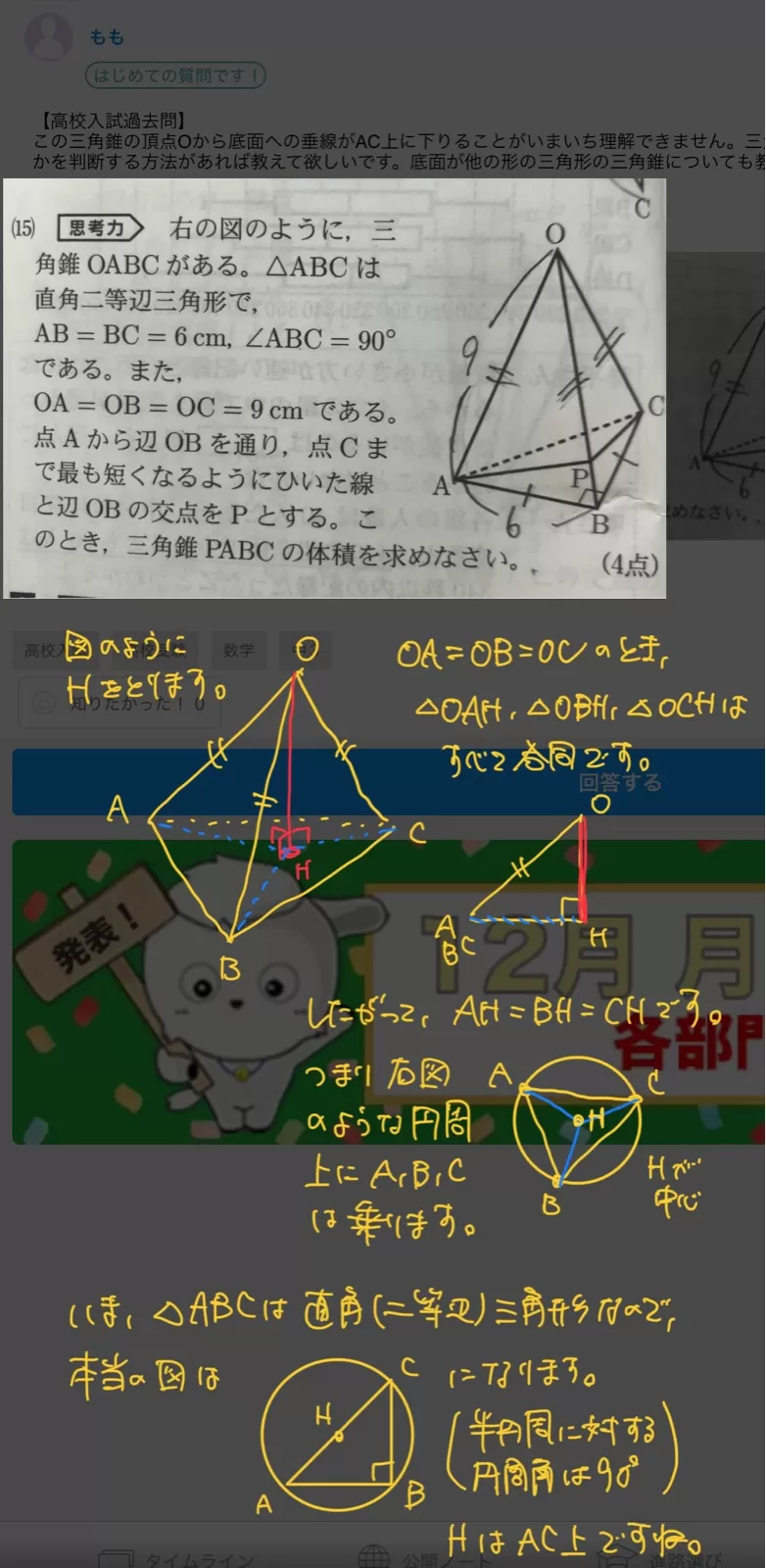 この三角錐の頂点Oから底面への垂線がAC上に下りることがいまいち理解できません。三角錐を上から見た時に頂点がどのような位置にあるのかを判断する方法があれば教えて欲しいです。底面が他の形の三角形の三角錐についても教えてくれると尚嬉しいです。